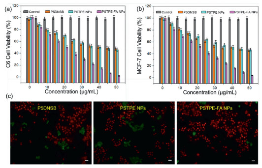 Figure 4.  (a) Cell viabilities of C6 cells cultivated with P5DNSB, PSTPE and PSTPE-FA NPs. n = 3. (b) Cell viabilities of MCF-7 cells cultivated with P5DNSB, PSTPE and PSTPE-FA NPs. n = 3. (c) Fluorescence images of Calcein AM (live cells, green) and PI (dead cells, red) contained MCF-7 cells after different treatments. Scale bar = 20 µm, [C] = 50 µg/mL.