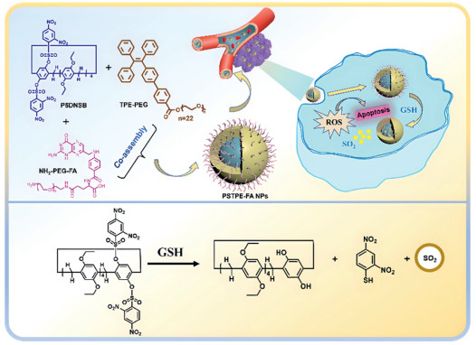• Scheme 1  Chemical structures of 2, 4-dinitrobenzene sulfonic acid-modified-pillar[5]arene (P5DNSB), tetraphenyl-PEG (TPE-PEG) and target guest (NH2-PEG-FA) and cartoon representations of the GSH responsiveness of the self-assembled NPs for SO2 gas therapy to induce ROS upregulation and consequent cancer cell apoptosis.