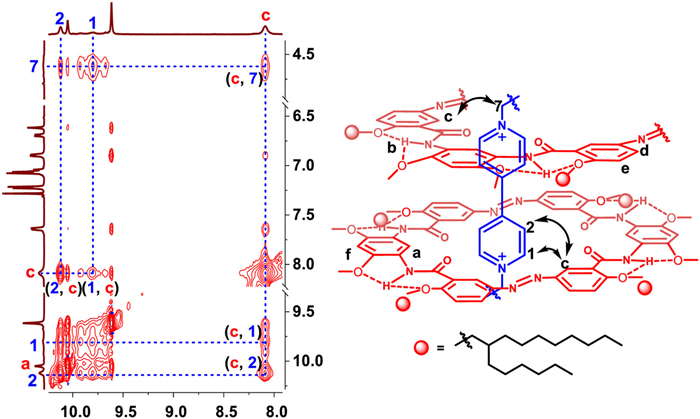 The 2D nuclear Overhauser effect (NOE) spectroscopy experiment was used to provide evidence for the threading of the axle component through the cavity of macrocycle 1 and thus the formation of the mechanical bond in [3]R-Boc (Fig. 1). Through-space cross-correlations were observed between protons H1, H2 and H7 at the BP binding site and the inner proton Hc of 1. Notably, proton H2 was shifted downfield more compared to proton H1, suggesting a larger deshielding effect after superposition than that of H1. This can be ascribed to the fact that both rings are located at the BP site and are very close in distance, resulting in H2 being able to form hydrogen bonds with both rings in the rotaxane [3]R-Boc simultaneously.