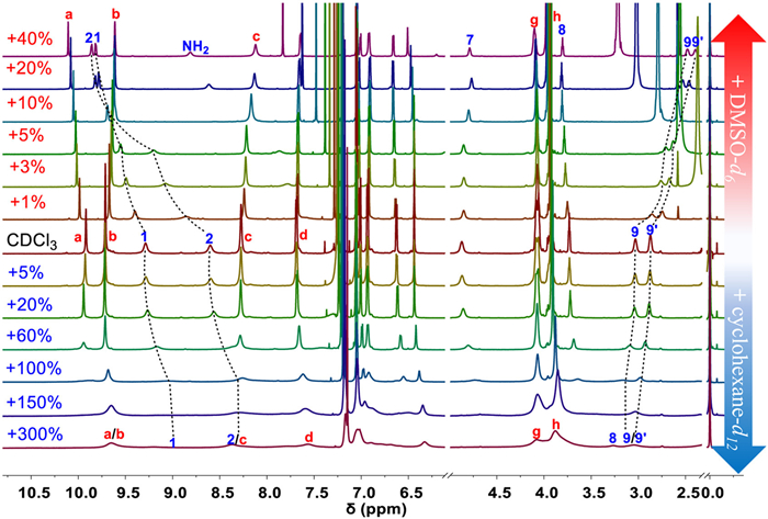 Figure 3.  Partial polar variable 1H NMR spectra of [3]R-H (800 MHz, CDCl3/DMSO-d6, CDCl3 and CDCl3/cyclohexane-d12, 298 K).