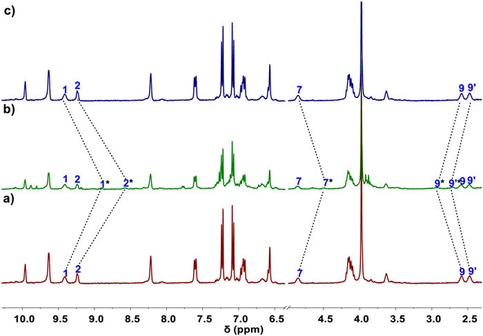 Figure 4  Partial 1H NMR spectra of [3]R-H (400 MHz, CD3CN, 298 K) (a) before (b) after 30 min 365 nm irradiation, and (c) after 20 min 450 nm irradiation.