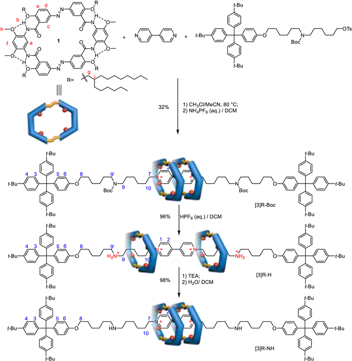 Scheme 1.  Synthetic route of [3]rotaxanes. Charges are counterbalanced by PF6 counterions, which are omitted for clarity.