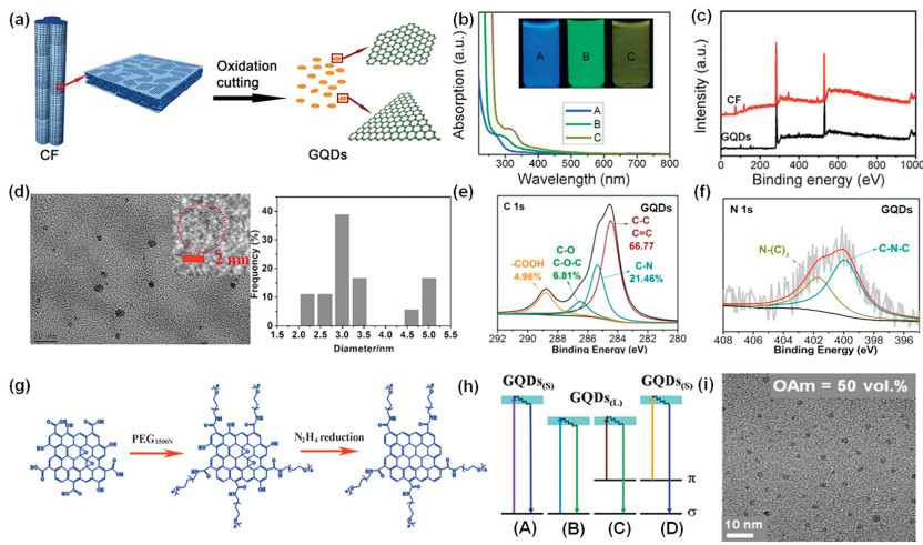 Figure 2  (a) Representation scheme of oxidation cutting of CF into GQDs. (b) UV–vis spectra of A, B, and C correspond to the synthesis reaction temperatures of GQDs at 120, 100, and 80 ℃, respectively. The illustration of (b) shows the corresponding GQDs with a 365 nm excited light gap under UV light. (c) XPS survey spectrum of CF and GQDs. Reprinted with permission [43]. Copyright 2012, American Chemical Society. (d) High resolution transmission electron microscopy (HR-TEM) images of GQDs and the right column shows the diameter distribution of GQDs. (e) High resolution XPS spectra of C 1s for GQDs. (f) High resolution XPS spectra of N 1s for GQDs. Reprinted with permission [44]. Copyright 2018, Multidisciplinary Digital Publishing Institute. (g) Representation of GQDs containing a surface passivator with oligo-PEG diamino. (h) A schematic illustration of various typical electronic transitions processes of GQDs. Normal PL mechanisms in GQDs for small size (A) and large size (B). Upconverted PL mechanisms in GQDs for large size (C) and small size (D). Reprinted with permission [45]. Copyright 2011, Royal Society of Chemistry. (i) TEM images of the GQDs with varied sizes of 2 nm. The text insets represent the concentration of OAm. Reprinted with permission [46]. Copyright 2014, American Chemical Society.