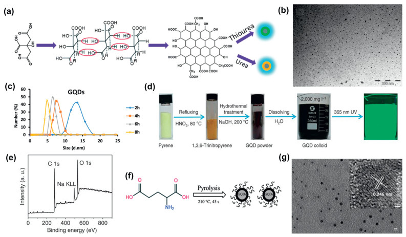 Figure 4.  (a) The growth mechanism of N-GQDs and S,N-GQDs. Reprinted with permission [74]. Copyright 2013, Nanoscale. (b) TEM image of GQDs. (c) DLS diagram of GQDs. Reprinted with permission [75]. Copyright 2022, Elsevier. (d) The production process of GQDs. (e) Survey XPS spectrum. Reprinted with permission [76]. Copyright 2014, Springer Nature. (f) Schematic diagram of the formation of GQDs through the pyrolysis of L-glutamic acid. (g) The HRTEM image of GQDs with a scale bar of 5 nm. Inset: A typical single GQD with a lattice parameter of 0.246 nm. The scale bar is 1 nm. Reprinted with permission [77]. Copyright 2013, Royal Society of Chemistry.