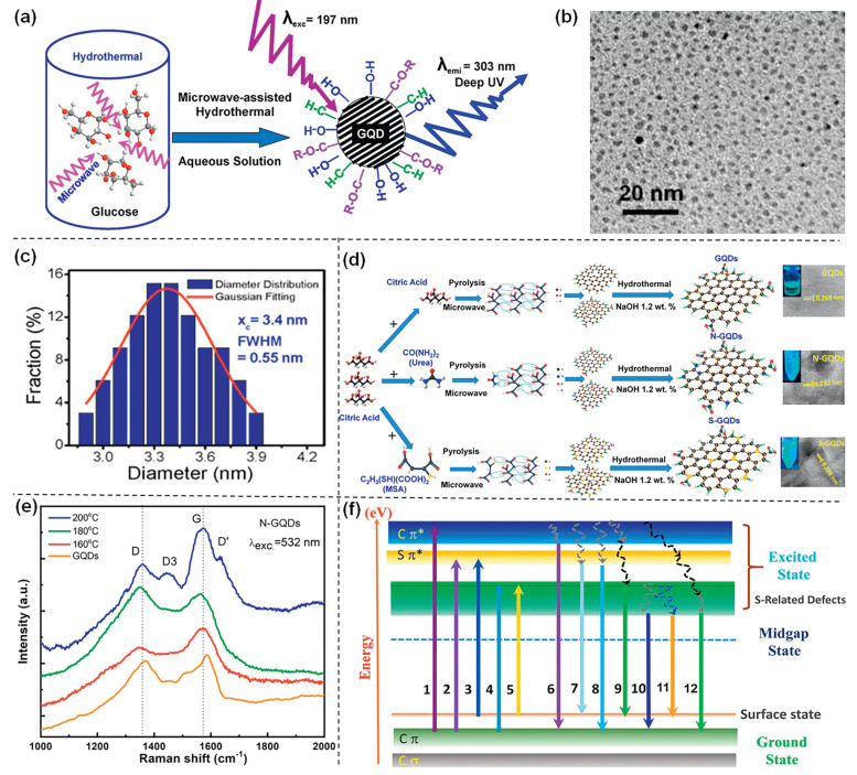 Figure 5.  (a) GQDs are prepared by MAH method. (b) TEM images of the GQDs. (c) Diameter distribution of GQDs, red line is Gaussian fitting curve. Reprinted with permission [78]. Copyright 2012, American Chemical Society. (d) Schematic diagram of GQDs, N-GQDs and S-GQDs prepared by microwave assisted method. (e) Raman spectra of GQDs and N-GQDs samples at different temperatures. (f) Proposed energy band diagram and electron transitions of S-GQDs and the possible emission mechanism. Reprinted with permission [79]. Copyright 2022, Springer.