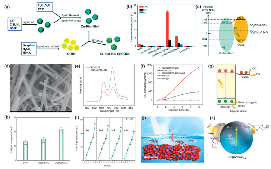 Figure 6  (a) Schematic illustration of the synthetic process of Zn-Bim-His-1@GQDs heterostructures. (b) CO2 photoreduction performance. Generation of CH4, CO and H2 over different samples in the first 12 h under visible light (λ > 420 nm) irradiation under the same conditions. (c) Schematic energy-level diagram based on the bandgaps and Mott-Schottky plot. Reprinted with permission [29]. Copyright 2020, Royal Society of Chemistry. (d) SEM images of GQDs@PCN-222 with a scale bar of 1 µm. (e) PL emission with excitation wavelength at 365 nm of PCN-222 and GQDs@PCN-222. (f) Photocatalytic CO2 reduction by photocatalysts. (g) Proposed photocatalytic mechanism of CO2 reduction to CO by GQDs@PCN-222. Reprinted with permission [105]. Copyright 2023, Multidisciplinary Digital Publishing Institute. (h) CO yield per hour of BWO, GQDs/BWO, and GQDs/BWO6−x. (i) Stability test of GQDs/BWO6−x using four-run recycling experiments under visible light irradiation at 0 ℃. (j) Illustration of GQDs/BWO6−x surface microstructure. (k) Illustration of a possible mechanism for photocatalytic CO2 reduction by GQDs/BWO6−x. Reprinted with permission [108]. Copyright 2022, Elsevier.