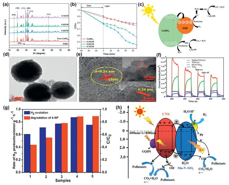 Figure 7.  (a) XRD patterns of GQDs, pure CuWO4, 0.3GCW, 0.5GCW, and 0.7GCW samples. (b) Photocatalytic degradation evaluation of phenol simulated wastewater demonstrated by change in concertation vs. irradiation time. (c) Mechanistic overview for photocatalytic degradation of phenol simulated wastewater. Reprinted with permission [114], Copyright 2023, Elsevier. (d) TEM images of GQDs/TCN-0.4. (e) HRTEM images of TCN-0.4. (f) photocurrent transient responses of the as-prepared samples. (g) The combination of degradation of 4-NP with H2 evolution under simulated solar irradiation over the as-prepared GQDs/TCN-x composites with different loadings of CNS (1: 10%, 2: 20%, 3: 30%, 4: 40%, 5: 50%). (h) Possible photocatalytic mechanism of degradation of organic pollutants coupled with simultaneous photocatalytic H2 evolution over GQDs/TCN-0.4 under simulated solar irradiation. Reprinted with permission [115]. Copyright 2018, Elsevier.