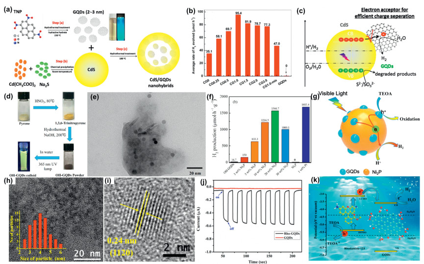 Figure 8.  (a) Schematic illustration of the preparation process of GQDs (step (a)), CdS nanoparticles (step (b)), and CdS/GQDs nanohybrids (step (c)). (b) Average photocatalytic H2 evolution rate over different samples. (c) Photocatalytic mechanism for enhanced H2 evolution activity over CdS/GQDs nanohybrids. Reprinted with permission [35]. Copyright 2017, Elsevier. (d) Synthetic procedure of OH-functionalized GQDs. (e) TEM image of composite sample. (f) The rate of H2 evolution over Ni2P/OH-GQDs photocatalyst hybrid with different amounts of Ni2P at room temperature under visible light (λ > 420 nm), and comparison of photocatalytic H2 evolution with 1 wt% Pt. The system contains 6 mg photocatalyst, 1.2 mg cocatalyst and 2 mL TEOA in 18 mL deionized water. (g) Schematic illustration of the mechanisms for the photocatalytic H2 evolution over Ni2P/OH-GQDs under visible light irradiation. Reprinted with permission [130]. Copyright 2018, Elsevier. (h) TEM images along with particle size distribution (inset) of our synthesized Rho-GQDs material. (i) High resolution image showing lattice plane with d spacing of our synthesized Rho-GQDs material. (j) Transient photocurrent response of GQDs and Rho-GQDs under simulated solar light irradiation. (k) Energy profile diagram of dye-sensitized Rho-GQDs system for H2 evolution under visible light irradiation. Reprinted with permission [131]. Copyright 2020, Elsevier.