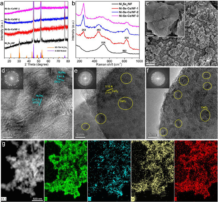 • Figure 1  (a) XRD patterns and (b) Raman spectra of Ni3Se2/NF, Ni–Se–Ce/NF-1, Ni–Se–Ce/NF-2, and Ni–Se–Ce/NF-3. (c) SEM image of Ni–Se–Ce/NF-2. HRTEM images of (d) Ni3Se2/NF and (e-f) Ni–Se–Ce/NF-2. Inset: FFT patterns. (g) Dark-field TEM image and the corresponding elemental mappings of Ni, Se, Ce, and O.
