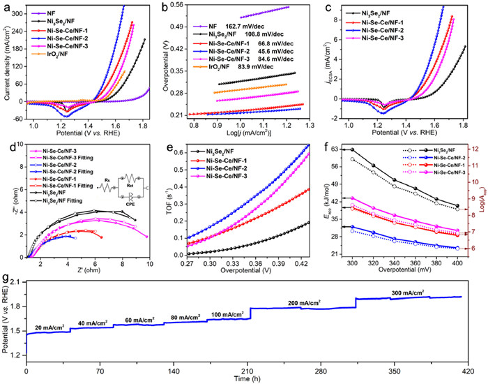 Figure 2.  (a) iR-corrected LSV curves. (b) Tafel plots. (c) ECSA-normalized OER polarization curves. (d) Nyquist plots. Inset: equivalent circuit. (e) TOF plots. (f) The Eapp values calculated from CV plots obtained under different temperatures (Figs. S12 and S13 for detailed information). The values of log(Aapp) acquired from the intercept at a constant potential via utilizing the Arrhenius plots during the calculation of Eapp values (Fig. S13). (g) Multi-step galvanostatic durability test of Ni–Se–Ce/NF-2 at the different current densities.