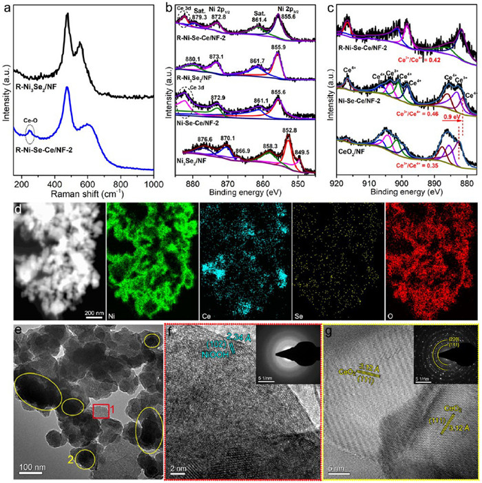 Figure 3  (a) Raman spectra. High-resolution XPS spectra of (b) Ni 2p and (c) Ce 3d (d) Dark-field TEM image and the corresponding elemental mapping images of R–Ni–Se–Ce/NF-2. (e) TEM image and (f, g) the corresponding HRTEM images of R–Ni–Se–Ce/NF-2. Inset: SAED patterns.