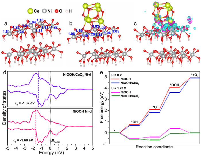Figure 4  Bader charge diagrams of (a) NiOOH and (b) NiOOH/CeO2. (c) Charge density difference diagram. Cyan and violet represent electron accumulation and electron depletion, respectively. (d) Density of states for Ni-3d orbitals of NiOOH and NiOOH/CeO2. (e) Free-energy diagrams for the OER pathway on NiOOH and NiOOH/CeO2 surfaces.
