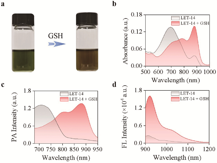 Figure 1  (a) Color change of LET-14 towards GSH. (b) UV–vis-NIR absorption, (c) PA spectra, and (d) NIR-Ⅱ FL (λex = 880 nm) of LET-14 (10 µmol/L) after incubation with/without GSH (50 µmol/L) for 30 min in dimethyl sulfoxide (DMSO)/phosphate buffered saline (PBS) (v/v = 2/3, pH 7.4).