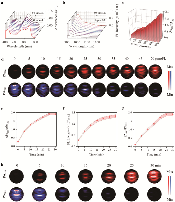 Figure 2  (a) UV–vis-NIR absorption, (b) NIR-Ⅱ FL spectra (λex = 880 nm), (c) the ratio of PA880/PA705 intensity and (d) the corresponding PA images of LET-14 (10 µmol/L) with the addition of GSH (0–50 µmol/L) for 30 min in DMSO/PBS (v/v = 2/3, pH 7.4). Time-dependent (e) Abs880/Abs695 intensity, (f) NIR-Ⅱ FL920 intensity (λex = 880 nm), (g) PA880/PA705 intensity and (h) the corresponding PA images of LET-14 after incubation with GSH (50 µmol/L) for 30 min in DMSO/PBS (v/v = 2/3, pH 7.4).