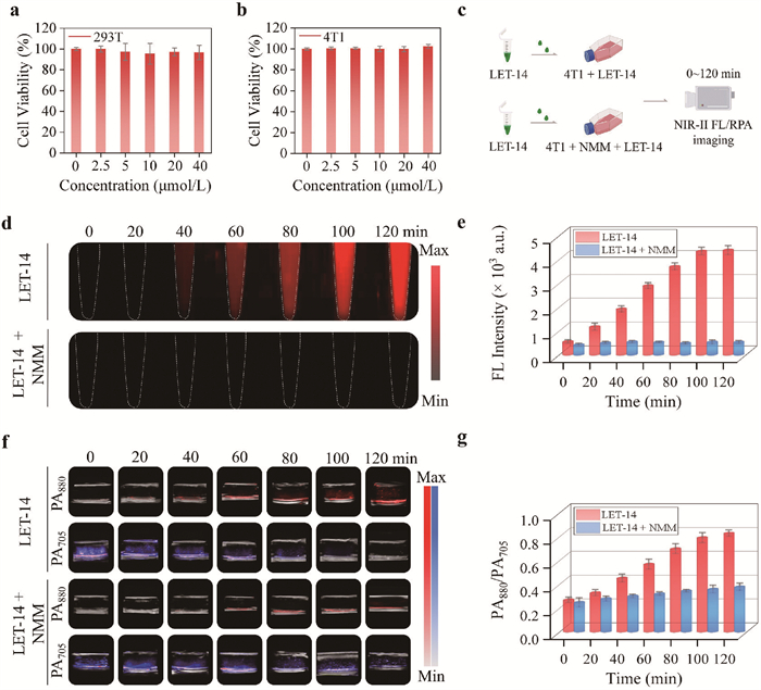 Figure 4  Cell viability estimated by MTT assay with HEK293T (a) and 4T1 (b) cells, which were cultured in the presence of LET-14 (0–40 µmol/L) for 24 h. (c) Schematic representation of NIR-Ⅱ FL and RPA imaging for 4T1 cells. (d) Time-dependent NIR-Ⅱ FL images of 4T1 cells with/without NMM pretreatment (0.5 mmol/L), respectively, then addition of LET-14 and (e) the corresponding quantitative FL intensity in (d). (f) Time-dependent PA images of 4T1 cells with/without NMM pretreatment (0.5 mmol/L), respectively, then addition of LET-14 and (g) the corresponding quantitative RPA intensity in (f). Data are presented as mean ± SD (n = 3).