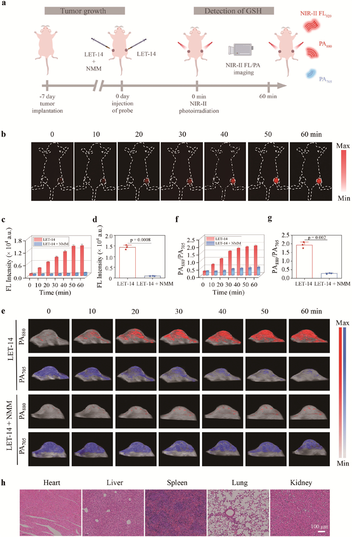 Figure 5  (a) Schematic representation of NIR-Ⅱ FL and RPA imaging for 4T1 tumors. (b) Time-dependent NIR-Ⅱ FL images of 4T1 tumor-bearing nude mice with or without NMM (1 mmol/L, 50 µL), respectively, then injection of LET-14. (c) The relative FL intensity of tumors collected from (b). (d) Quantification of FL intensity of tumors at 60 min (P = 0.0008). (e) In vivo PA images of 4T1 tumor-bearing nude mice. (f) RPA signal of PA880/PA705 measured as a function of post-injection time. (g) Quantification of RPA signals of tumors at 60 min (P = 0.002). (h) H&E stained images of major organs (heart, liver, spleen, lung, and kidney) were obtained from mice 14 days post-injection of LET-14 (scale bar: 100 µm). Data are presented as mean ± SD (n = 3).