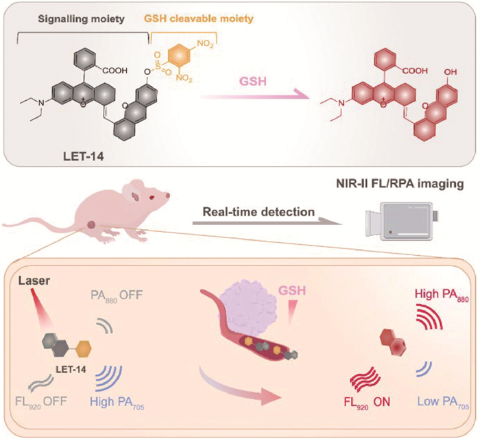 Scheme 1.  Schematic illustration of an activatable NIR-Ⅱ FL and RPA dual-modality probe (LET-14) for in vivo GSH imaging.