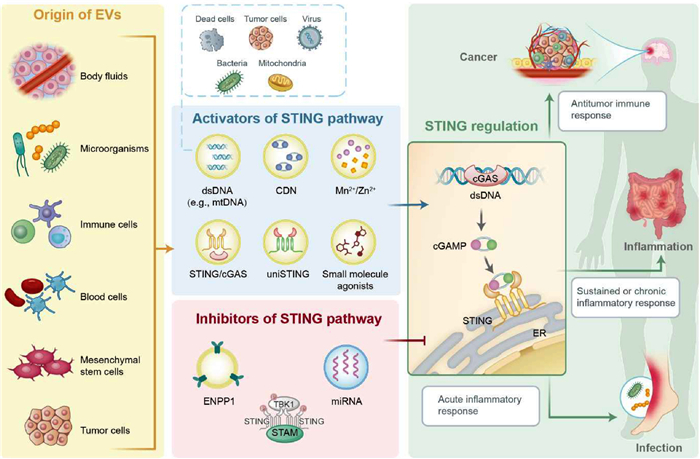 STING signaling associates with various inflammatory diseases. When the pathway is overactivated, it can cause excessive inflammation, contributing to conditions such as autoimmune diseases, cardiovascular diseases and metabolic diseases. Inflammatory pathogenesis is generally EV@STING-involved.