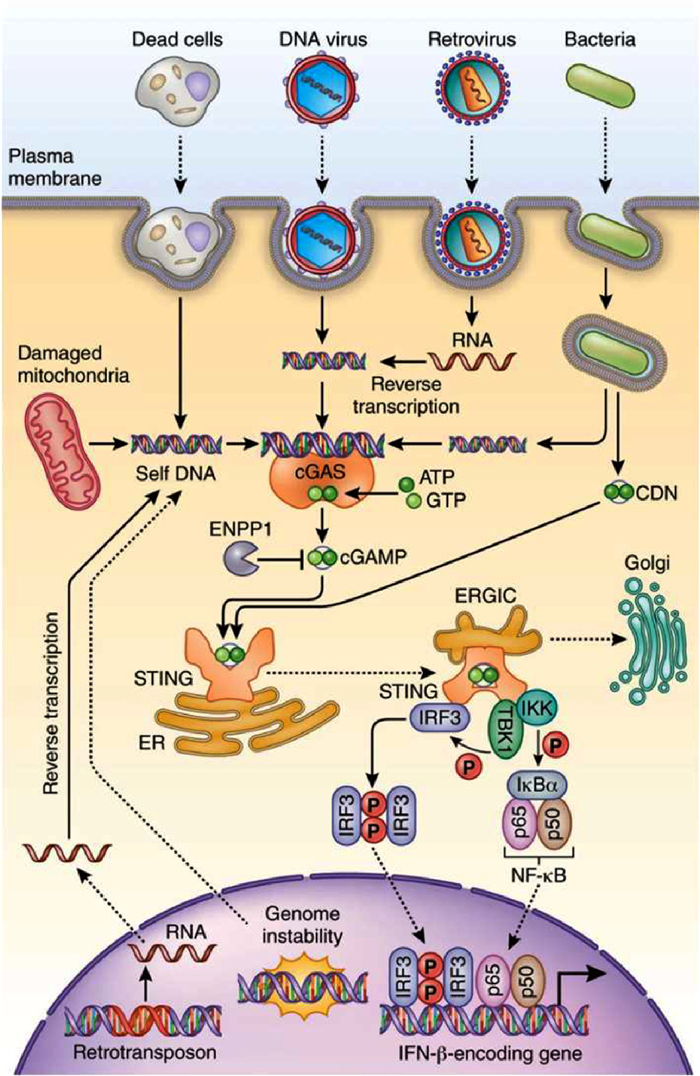 DNA mis-segregation during cell division generates micronuclei that consist of chromatin surrounded by nuclear membrane. Following the rupture of the micronucleus membrane, exposed chromatin DNA can be recognized by cGAS and thus activates the cGAS-STING pathway. In addition to replication stress and genomic instability, micronuclei can also occur after exposing to genotoxic stress, ionizing radiation, or the induction of chromosome segregation errors. However, the micronuclei formed as a result of genotoxic insults contain histone-bound self-DNA, which inhibits the binding of cGAS and therefore cannot trigger the cGAS-STING pathway [42]. Apart from the micronuclei DNA, the ectopic mtDNA is also a stimulator of inflammatory response [43,44]. In certain pathological conditions, e.g., genotoxic stress, oxidative stress, viral infection, high levels of proinflammatory factors, and mitochondrial dysfunction, mtDNA can be released and activates the cGAS-STING pathway [45]. RNA virus infection may result in cellular damage and cell death, which can lead to the release of cellular DNA [46]. DNA intermediates are produced during reverse transcription process that occurs in retroviruses [46]. Summarily, DNA that initiates cGAS-STING pathway can be endogenous from the nucleus and mitochondria or is exogenous from viruses or bacteria.