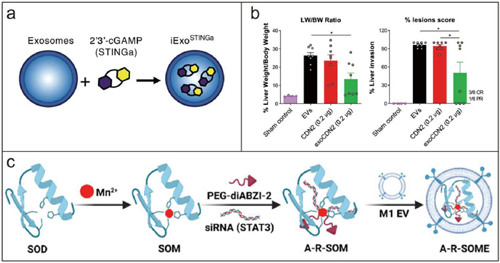 Figure 3  Engineered EV@STING derived from normal cells. (a) Schematic representation of iExoSTINGa generation. Reproduced with permission [167]. Copyright 2021, American Society for Biochemistry and Molecular Biology. (b) 15 days after administration of exoSTING, liver weight (LW) over body weight (BW) was calculated and% lesions scores were evaluated. Reproduced with permission [168]. Copyright 2021, Springer Nature. (c) Schematic illustration of the A-R-SOME preparation. Reproduced with permission [169]. Copyright 2024, American Chemical Society.