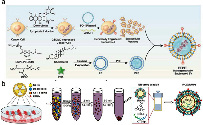 Figure 4.  Engineered EV@STING derived from tumor cells. (a) Schematic illustration of the design and synthetic route of nano/genetically engineered EVs. Reproduced with permission [175]. Copyright 2024, Wiley. (b) Schematic illustration of RC@RMP preparation. Reproduced with permission [176]. Copyright 2024, BioMed Central.
