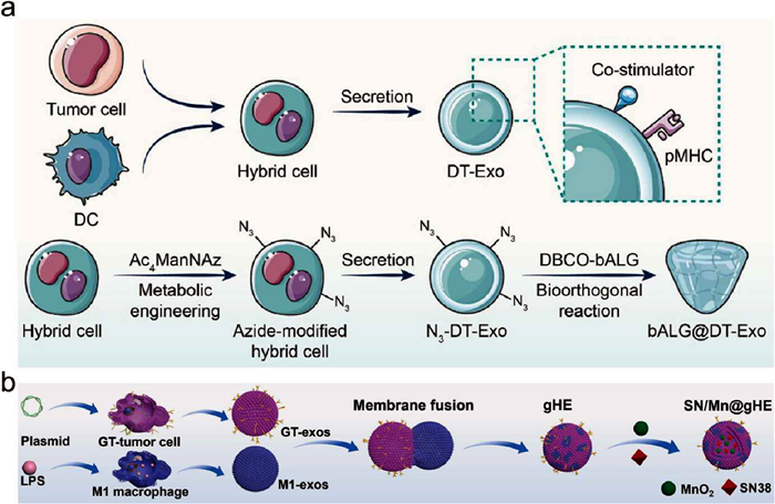 Figure 5  Engineered EV@STING generated from hybrid cells. (a) Schematic illustration of bALG@DT-Exo gels preparation. Reproduced with permission [179]. Copyright 2024, American Chemical Society. (b) Schematic diagram of SN/Mn@gHE preparation. Reproduced with permission [180]. Copyright 2023, Elsevier.