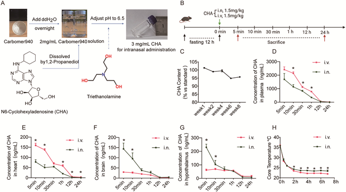 Figure 1.  Preparation of a CHA nasal gel and its distribution dynamics. (A) The procedure of the preparation of CHA nasal gel. (B) Timeline of CHA administration intranasally (i.n.) or intravenously (i.v.) at a dose of 1.5 mg/kg. Blood and tissue samples were collected at various time points post-administration for analysis. (C) Stability test of CHA in the nasal gel formulation over 8 weeks. Concentration of CHA in plasma (D), heart (E), whole brain (F) and hypothalamus (G) over time following CHA administration. (H) Core temperature changes over time following CHA administration. Data are presented as mean ± SEM. Unpaired t-test was performed in all experiments. *P < 0.05.