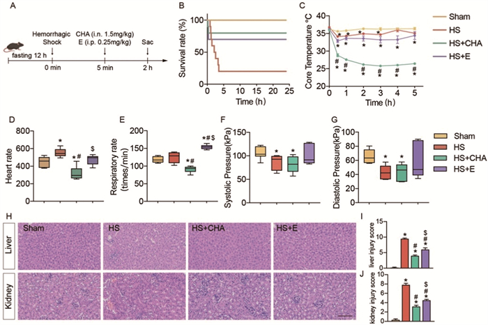 Figure 2  CHA induced torpor-like status decreases the mortality of HS and inhibits the energy mobilization in liver. (A) Schematic of the experimental protocol. (B) Survival rate over 24 h following HS and treatment. (C) Core temperature over 5 h after HS and treatment. Cardiovascular parameters were analyzed among groups, including heart rate (D), respiratory rate (E), systolic pressure (F) and diastolic pressure (G). Histopathological analysis of liver and kidney tissues (H) and injury scores (I, J). Data are presented as mean ± SEM (n = 6 per group). One-way ANOVA followed by Tukey’s post hoc analysis was performed in all experiments. *P < 0.05 vs. Sham group; #P < 0.05 vs. HS group; P < 0.05 vs. HS+CHA group. Scale bar: 100 µm. E, epinephrine.
