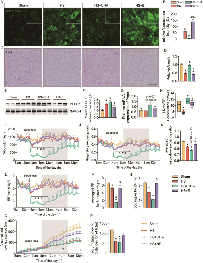 Figure 3  CHA decreases the metabolic rate in HS model. (A) Representative images of mitochondrial ROS levels in liver by Mito-Hyper7 probe. (B) Quantification of relative fluorescence intensity of Mito-Hyper7 in A. (C) Representative images of glycogen content in liver by periodic acid-Schiff (PAS) staining. (D) Quantification of relative glycogen area in C. (E) Western blot analysis showing protein expression levels of phosphoenolpyruvate carboxykinase (PEPCK) and glyceraldehyde-3-phosphate dehydrogenase (GAPDH) in liver. (F) Quantification of E. (G) Relative mRNA expression of PEPCK in liver. (H) ATP concentration in liver tissue lysate. (I) Oxygen consumption over time in four groups. (J, K) RER over time (J) and average RER during a 6-h period after HS (K). EE over time (L) and averaged energy expenditure during a 6-h period after HS (M). (N) Food intake over 24 h after HS. (O, P) Accumulated moving distances over time. Data are presented as mean ± SEM (n = 6 per group). One-way ANOVA followed by Tukey’s post hoc analysis was performed in K, M, N, P. Two-way ANOVA was performed for I, J, L, O to evaluate the effects of treatment and time on each parameter. Tukey’s post hoc test was conducted for multiple comparisons among the groups. *P < 0.05 vs. sham group; #P < 0.05 vs. HS group; P < 0.05 vs. HS+CHA group. Scale bar: 50 µm for A, 20 µm for C.