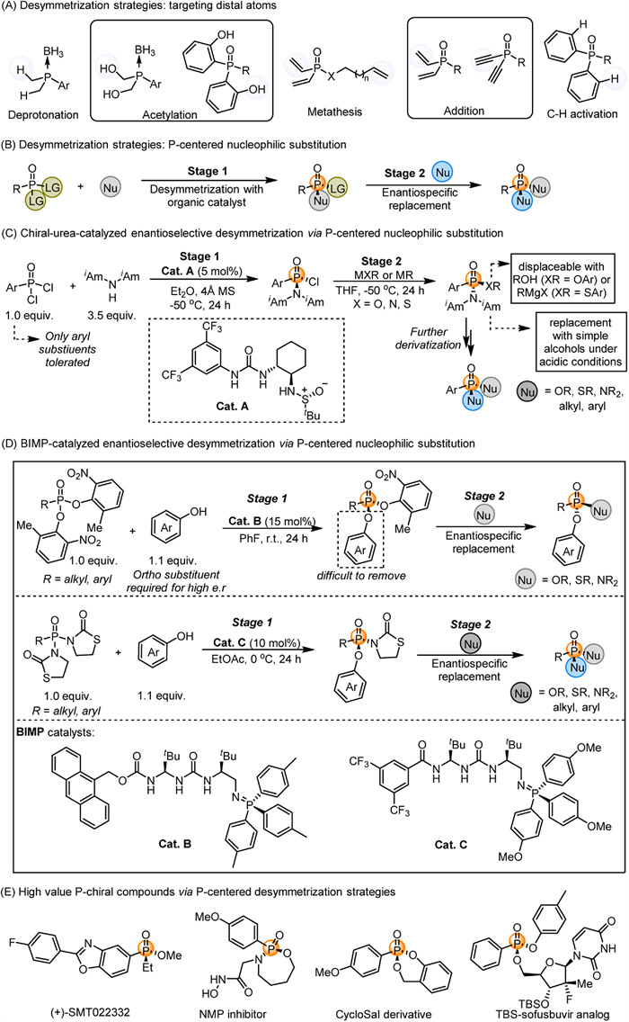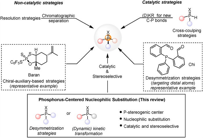 Beyond the traditional chiral reagent-based resolution of racemic phosphorus compounds and the diastereoselective synthesis with chiral auxiliaries (Fig. 2, left) [11-20], which typically require stoichiometric chiral reagents and multiple steps, the developed catalytic methods mainly include the desymmetrization of tertiary phosphorus (targeting distal atoms) [21-28] and the (dynamic) kinetic transformation of secondary phosphines and their derivatives for new C-P bonds (Fig. 2, right) [29, 30], typically limited to all carbon substituents on phosphorus. Recently, Jacobsen's group demonstrated that a chiral hydrogen-bond-donor catalyst enables enantioselective SN2 dealkylation in Michaelis–Arbuzov reactions, producing highly enantioenriched H-phosphinates as versatile P-stereogenic building blocks [31]. In addition, strategies based on phosphinic acid and its derivatives [32-34], as well as phosphonium salts [35-37], have proven effective for the construction of P-chiral compounds. Most of these strategies rely on metal catalysts and are mainly applicable to the synthesis of chiral phosphine oxides, while the reported pharmaceuticals are mostly based on structures such as phosphonamidates, phosphonates, and phosphinates. To overcome these limitations, recent catalytic strategies based on nucleophilic substitution at the P-center have been developed, offering promising alternatives for the synthesis of P-stereogenic compounds with high stereoselectivity and efficiency. Despite the significant advantages of this strategy in producing high-value chiral phosphorus compounds, it is still in its infancy and faces numerous challenges. Currently, phosphorus-centered nucleophilic substitution mainly involves the desymmetrization strategies of prochiral P(Ⅴ) compounds and the (dynamic) kinetic transformation of tertiary phosphines and their derivatives (Fig. 2, bottom). This review provides an overview of advancements in the construction of P-stereogenic centers based on P-centered nucleophilic substitution, focusing on three main aspects: (1) desymmetrization strategies based on P-centered nucleophilic substitution; (2) the challenge of racemization in tertiary phosphines and their derivatives; and (3) catalytic P(Ⅴ)-centered nucleophilic substitution for high-value P-chiral compounds. We aim for our discussion to inspire further advancements and provide valuable insights for continued development in this field.