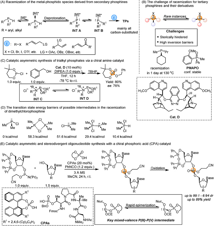In 2003, Hayakawa's group reported the first catalytic asymmetric synthesis of P-chiral trialkyl phosphates via dynamic kinetic resolution (Fig. 4C), utilizing a chiral amine promoter to achieve the stereoselective coupling of racemic phosphorochloridites with alcohols to produce optically active trialkyl phosphates after stereospecific oxidation [80]. Although only a few examples, this work represents a significant advancement in the asymmetric synthesis of organophosphorus compounds, which previously required a stoichiometric amount of the chiral source to construct the P-chiral center [81-83]. Mechanistically, the authors proposed that the INT C and INT D formed during the reaction could interconvert, with their interconversion rate being faster than their subsequent reaction with alcohol. In the same year, Humbel et al. investigated the configurational stability of chlorophosphines using DFT calculations and experimental studies and demonstrated that traces of HCl in the reaction medium could catalyze the racemization of chlorophosphines by facilitating the chiral inversion of the P-center [84]. They used dimethylchlorophosphine as a model to calculate the transition state energy barriers of several intermediates potentially involved in its racemization process (Fig. 4D). However, these results demonstrate again that the configurational inversion of tertiary phosphines requires high pyramidal inversion barriers, contradicting the proposal of Hayakawa et al. that the chiral amine-assisted intermediates INT C and INT D can rapidly interconverted.