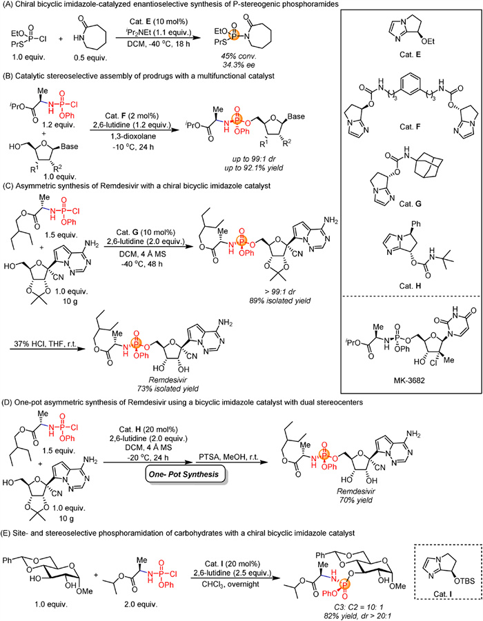 In 2017, DiRocco et al. disclosed a catalytic stereoselective phosphorylation of nucleosides using a chiral bicyclic imidazole-derived multifunctional catalyst, achieving the assembly of P-stereogenic nucleotide phosphoramidate prodrugs with high stereoselectivity (99:1) through a dynamic kinetic process (Fig. 5B) [89]. This method not only bypasses the need for chiral auxiliaries or non-racemic phosphorylating agents but also enhances the synthesis of clinically relevant nucleoside analogs like MK-3682, a hepatitis C virus (HCV) polymerase inhibitor. Their work represents a significant advance in the stereoselective synthesis of phosphorus-based prodrugs, with broad applicability in antiviral and anticancer therapies. Subsequently, in 2020, Zhang's group demonstrated that chiral bicyclic imidazole catalysts can be used in the asymmetric catalytic synthesis of Remdesivir, an antiviral drug for treating Ebola virus and COVID-19 (Fig. 5C) [90]. The researchers validated the scalability of this method through a 10-g scale synthesis. The protected Remdesivir was obtained in 89% yield with a diastereomeric ratio of > 99:1. After deprotection with 37% HCl in THF, the desired Remdesivir was obtained in 73% isolated yield. Moreover, the catalyst was successfully regenerated after column chromatography and reused in the next catalytic cycle without any noticeable loss in catalytic efficiency. Additionally, in 2021, Hung, Wong, and co-workers achieved a one-pot synthesis of Remdesivir using a bicyclic imidazole catalyst with dual stereocenters (Fig. 5D) [91]. Employing 20 mol% of the chiral imidazole-cinnamaldehyde-derived carbamate, they performed a 10-g scale synthesis. After protecting group removal and a single recrystallization step, Remdesivir was obtained in 70% yield with a diastereomeric ratio of 99.3:0.7. In 2019, Tang's group demonstrated that chiral bicyclic imidazole catalysts could be effectively applied to carbohydrate compounds, offering a streamlined approach for the selective synthesis of phosphoramidated carbohydrate-based prodrugs and natural products through site- and stereoselective phosphoramidation (Fig. 5E) [92]. Although these represent significant breakthroughs in phosphoramidation—achieving high stereoselectivity at the phosphorus center with a small molecule catalyst, these strategies are limited to chlorophosphoramidates that contain an -NH group.