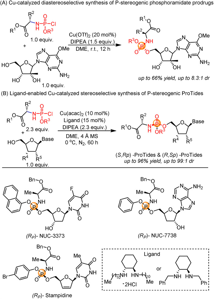 Metal-catalyzed phosphoramidation, alongside organocatalytic approaches, has achieved notable progress and plays a pivotal role in the synthesis of P-stereogenic phosphoramidate prodrugs. In 2015, Pertusati's group reported the first copper-catalyzed diastereoselective synthesis of P-stereogenic phosphoramidate prodrugs (Fig. 6A) [93]. Through careful optimization of the metal catalyst, base, and solvent, they achieved selective phosphorylation of unprotected nucleosides, attaining moderate conversion rates and diastereomeric ratios of up to 8.3:1. Prior to this, the diastereoselective synthesis of ProTides often relied on the use of chiral auxiliaries [94, 95] and diastereomerically pure phosphoramidating agents featuring p-nitrophenyl or pentafluorophenyl as leaving groups [96]. Recently, Shang et al. have developed a ligand-enabled, copper-catalyzed method for the stereoselective synthesis of P-stereogenic ProTides (Fig. 6B) [97]. The success of this approach lies in integrating a newly developed chiral diamine ligand with a copper catalyst, forming a chiral metal complex that activates the electrophilic phosphorylating reagent and facilitates a base-promoted nucleophilic substitution pathway. It enables the highly stereoselective synthesis of previously inaccessible (S, R) and (R, S) ProTide derivatives using catalysts of different configurations, achieving diastereomeric ratios of up to 99:1, whereas previous catalytic methods were limited to the synthesis of (R, R) and (S, S) ProTide derivatives. This method has been proven effective for various nucleosides and phosphoramidates and is particularly valuable for the synthesis of clinically relevant ProTides, such as (R)-NUC-3373 and (R)-NUC-7738, whose diastereomeric mixtures are currently being clinically evaluated for the treatment of solid tumors, as well as (R)-Stampidine, which is currently being investigated in Phase I clinical trials for the treatment of HIV.