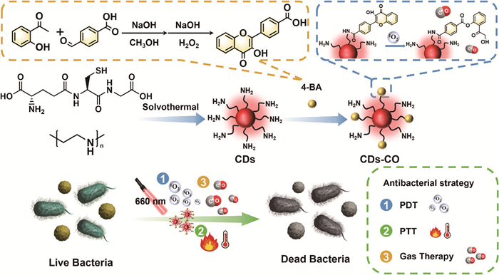 • Figure 1  Schematic illustration of the preparation of CDs-CO and their application for integrating photodynamic, photothermal, and gas treatment against bacterial infection.