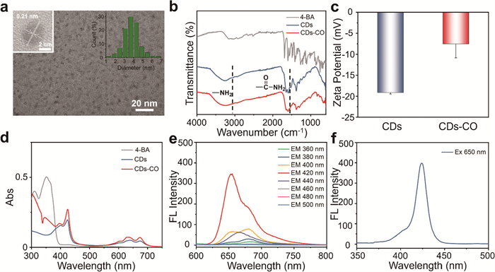 Figure 2  (a) TEM image of CDs-CO (insert: particle size distribution and HR-TEM image). Scale bar: 20 nm (inset: 2 nm). (b) FT-IR spectra of 4-BA, CDs, and CDs-CO. (c) Zeta potentials of CDs and CDs-CO. (d) UV–vis spectra of 4-BA, CDs, and CDs-CO. (e) FL emission spectra of CDs-CO under different excitation wavelengths. (f) The FL excitation spectrum of CDs-CO.
