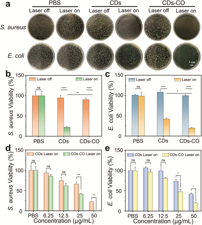 Figure 5  (a) Agar plate digital photographs of S. aureus and E. coli after being treated with PBS, CDs, and CDs-CO (50 µg/mL) with or without laser irradiation, and corresponding survival rates for (b) S. aureus, and (c) E. coli. Scale bar: 1 cm. The relative survival rates of (d) S. aureus, and (e) E. coli treated with CDs and CDs-CO (0–50 µg/mL) under 660 nm laser irradiation (440 mW/cm2, 20 min). *P < 0.05, **P < 0.01, ***P < 0.001, ****P < 0.0001, ns represents no significant difference. Data represent mean ± SD from three times independent experiments.
