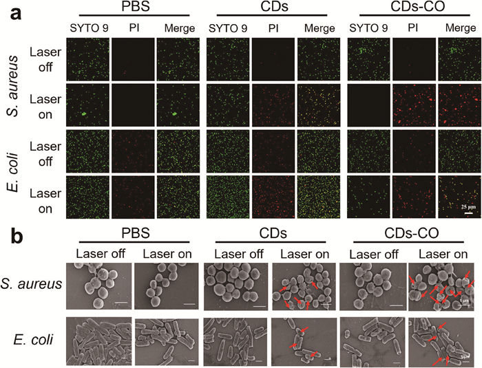 Figure 6  (a) Live/dead FL staining images of S. aureus and E. coli after treatment with PBS, CDs, and CDs-CO with or without laser irradiation. Scale bar: 25 µm. (b) SEM images of S. aureus and E. coli after treatment with PBS, CDs, and CDs-CO with or without laser irradiation. Scale bar: 1 µm.