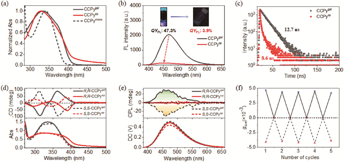 Figure 1  UV–vis (a), fluorescence (b), fluorescence decay curves (c), CD (d) and CPL (e) spectra of the gel (black lines) and suspension (red lines) of CCPy in toluene ([CCPy] =14.0 mmol/L). (f) Changes in glum values of CCPy assemblies in the mechanical stimulation and heating-cooling cycles: blue and red triangles represent R,R- and S,S-CCPy assemblies, respectively. λex = 340 nm. The insets in (b) are photographs of CCPy gel and suspension in toluene under 365 nm light.