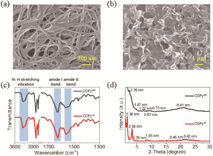 Figure 2  SEM images of CCPy gel (a) and suspension (b) in toluene. FT-IR spectra (c) and XRD patterns (d) of CCPy gel (black lines) and suspension (red lines) in toluene.