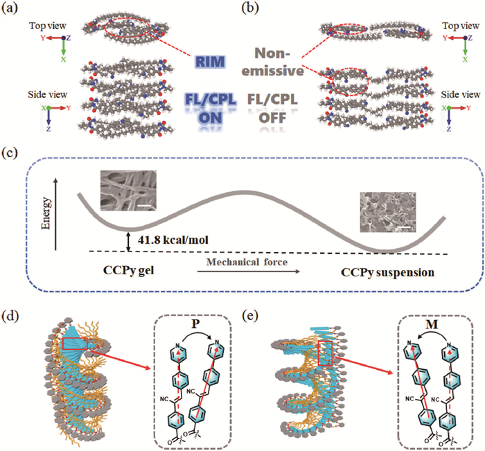 Figure 3.  Theoretical calculations of CCPy assemblies in the gel (a) and suspension (b) states. (c) The potential energy surface of CCPy assemblies in the gel and suspension states. Scale bar: 300 nm (for the fibers) and 1 µm (for the wrinkled nanosheets). Schematic illustrations of the self-assembled structures (left) and packing modes of the π-conjugated chromophores (right) in the gel (d) and suspension (e) states.