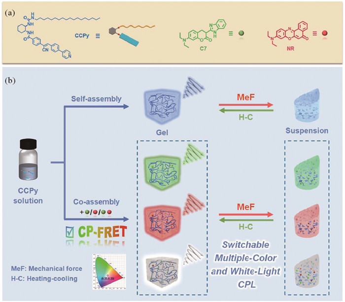 Scheme 1.  (a) Molecular structures and schematic illustrations of CCPy, C7 and NR. (b) Schematic illustration of self-/co-assembly of CCPy and the two dye molecules which leads to a mechano-responsive multi-color and white-light CPL supramolecular system.