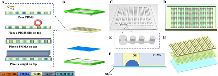 Figure 1.  (A) Schematic diagram of the preparation of microfluidic chip. (B) Schematic diagram of the microfluidic chip precision bonding. (C) Digital photograph of microfluidic chip. (D) SolidWorks drawing of mental mold. (E) SolidWorks drawing of single structure. (F) Diagram of one chamber. (G) Chip explosion diagram.
