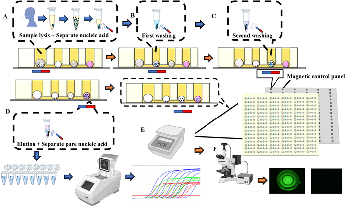 Figure 2  (A) Sample lysis & separate nucleic acid. (B) First washing, (C) second washing. (D) Elusion & Separate pure nucleic acid. (E) Results of in-tube PCR amplification. (F) On-chip fluorescence results.