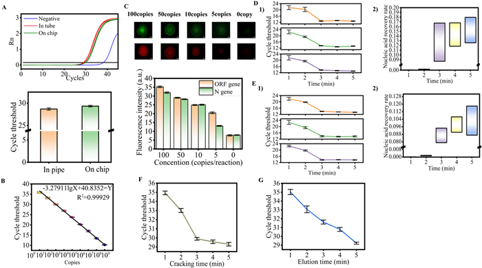Figure 3  (A) In-tube and on-chip nucleic acid amplification maps. (B) Gradient amplification map of ORF1ab gene: Y = −3.2791lgX + 40.8352, R2 = 0.99929. (C) Pseudovirus gradient dilution: Pseudovirus gradient copies: 100, 50, 10, 5 copies and 0 copy. Scale bars are 1 mm. (D1) In-tube magnetic beads were used to bind nucleic acid for 1, 2, 3, 4, 5 min. (D2) In the tube, the magnetic beads were bound to nucleic acid at 1, 2, 3, 4, 5 min. (E1) On chip magnetic beads binding of nucleic acid amplification ability map for 1, 2, 3, 4, 5 min. (E2) The map of nucleic acid content bound by magnetic beads in 1, 2, 3, 4, 5 min. (F) Pseudoviruses were lysed for 1, 2, 3, 4, 5 min. (G) Pseudoviruses were eluted for 1, 2, 3, 4, 5 min. Error bars represent the standard deviation based on at least 3 replicates of each experiment.