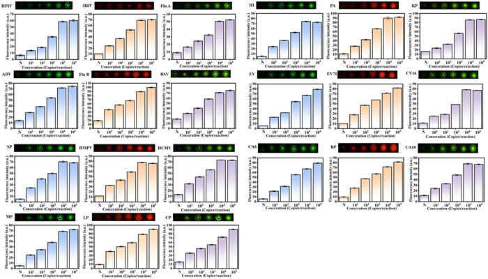 To evaluate the practicality of the microfluidic chip, we first selected a series of commercial kits for the detection of multiple respiratory pathogens. In the specific experimental operation, we performed gradient dilution of the plasmids in the commercial kits, and replaced the amplification reagent in the last chamber with the corresponding reagent in the commercial kits. Then, the experiment was carried out according to the established amplification procedure. Fig. 4 shows the on-chip gradient test results of 21 respiratory pathogen plasmids. 21 kinds of respiratory tract pathogens are: human parainfluenza virus (HPIV), human rhinovirus (HRV), influenza A (Flu A), adenovirus (ADV), influenza B virus (Flu B), respiratory syncytial virus (RSV), streptococcus pneumoniae (SP), human metapneumovirus (HPMV), human cytomegalovirus (HCMV), mycoplasma pneumoniae (MP), chlamydia pneumoniae (CP), legionella pneumophila (LP), klebsiella pneumoniae (KP), pseudomonas aeruginosa (PA), haemophilus influenzae (HI), enterovirus (EV), coxsackievirus 16 (CV16), enterovirus 71 (EV71), coxsackievirus A6 (CA6), coxsackievirus A10 (CA10), bordetella pertussis (BP). The experimental data indicate that the chip can efficiently achieve the parallel detection task of multiple respiratory pathogens, showing excellent multi-target detection ability and wide practicality.
