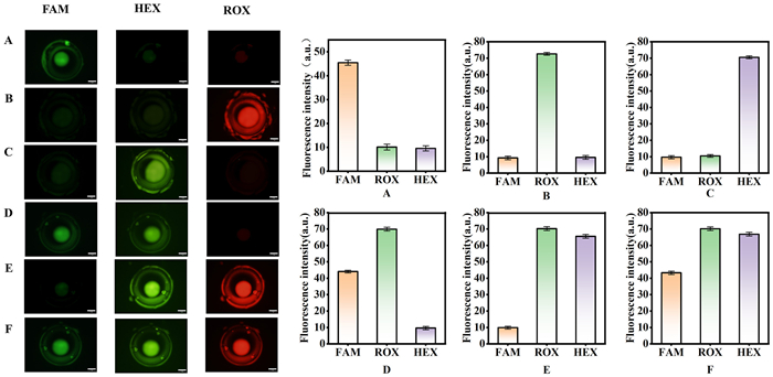 Figure 4.  Fluorescence readings were obtained from 6-carboxyfluorescein (FAM), hexachlorofluorescein (HEX) and carboxy-X-rhodamine (ROX) channels using fluorescence microscope. These are the same fluorescence readings. The error bars represent the standard deviation of at least 3 repeated experiments.