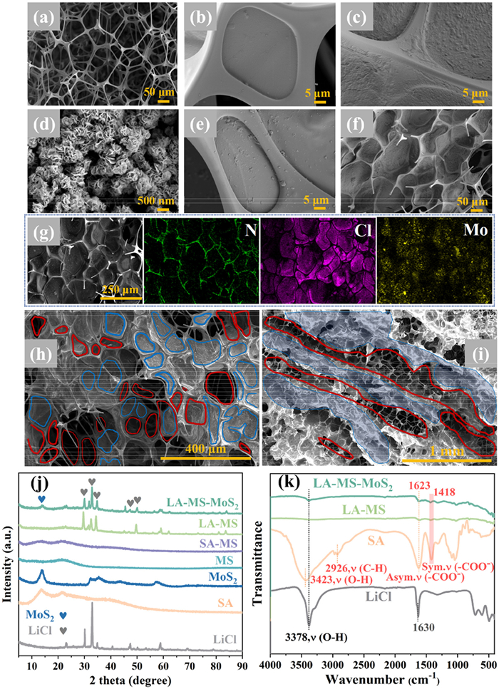 Figure 1.  The morphological structure and chemical composition of the samples. (a) MS. (b) SA-MS. (c) LA-MS. (d) MoS2. (e) SA-MS-MoS2. (f) LA-MS-MoS2 surface (small scale). (h) LA-MS-MoS2 surface (large scale). (i) Cross-section of LA-MS-MoS2 SEM images. (g) EDS mapping spectrum of LA-MS-MoS2. (j) XRD pattern and (k) FT-IR spectrum of prepared samples.