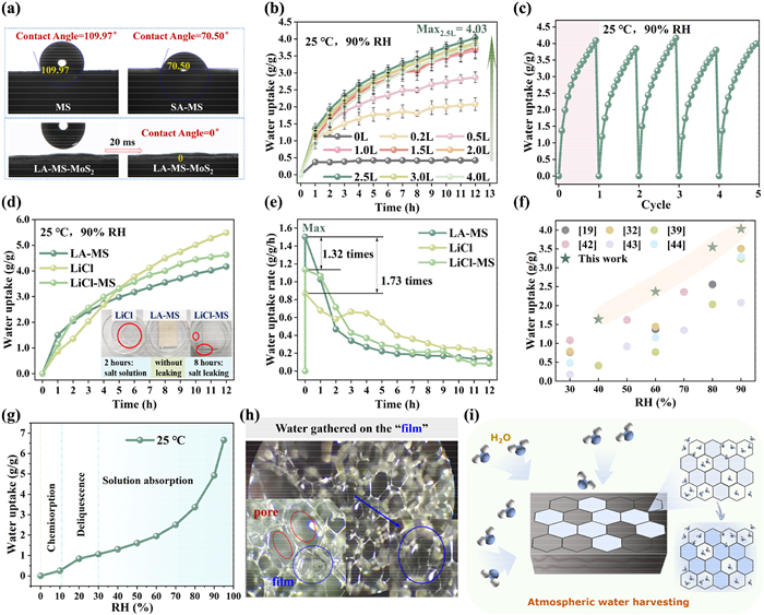 Figure 2  Performance of water vapor adsorption of the prepared samples. (a) The contact angle of the samples. (b) The water vapor sorption kinetics of LA-MS loaded with different LiCl concentrations (0–4.0 mol/L) at 25 ℃, 90% RH. (c) The moisture adsorption cycling test of LA-MS (loaded with 2.5 mol/L LiCl) at 25 ℃, 90% RH. (d) The moisture adsorption performance test of LiCl powder (abbreviated as LiCl), LiCl solution directly impregnated onto MS samples (abbreviated as LiCl-MS), and LA-MS at 25 ℃, 90% RH, with the inset showing the corresponding moisture adsorption process and whether the salt solution leaked. (e) A comparison of the moisture adsorption rates of the samples in (d). (f) Moisture adsorption performance comparison of LA-MS with reported studies. (g) The water sorption isotherms of LA-MS-MoS2 at 25 ℃. (h) The optical microscope image of LA-MS-MoS2 during moisture adsorption and (i) Schematic of water vapor transport from ambient air to sorbents. light blue: LA "film", dark blue: water vaper adsorbed and aggregated on the LA "film".