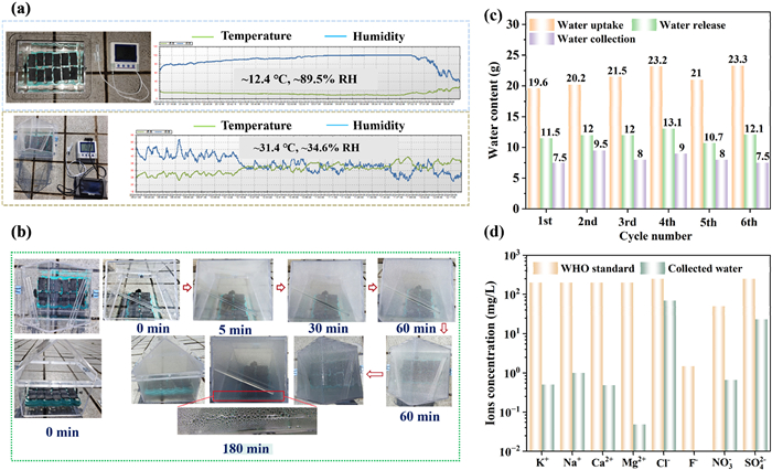 Figure 4.  Solar-driven atmospheric water harvesting outdoor experiments. (a) Twelve pieces of LA-MS-MoS2 underwent atmospheric water adsorption for 12 h overnight (top) and water production through sunlight exposure for 3 h the following day (bottom), along with temperature and humidity changes. (b) A physical photo of solar-driven atmospheric water the next day. (c) Water uptake, water release, and water collection in six cyclic tests. (d) Water quality analysis.