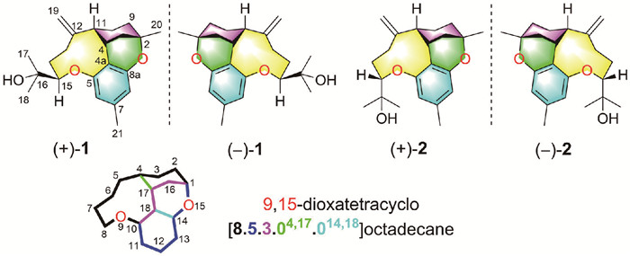 • Figure 1  Chemical structures of (±)-dauroxonanols A (1) and B (2) and the nomenclature of the unprecedented ring system.